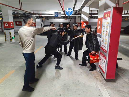 與此同時(shí),應(yīng)急處置崗隊(duì)員也攜帶防暴盾牌、橡膠棍等專(zhuān)業(yè)器械火速集結(jié),以最快速度抵達(dá)地下車(chē)庫(kù)指定區(qū)域。面對(duì)負(fù)隅頑抗的 “盜竊分子”,隊(duì)員們沉著冷靜,憑借日常訓(xùn)練形成的默契配合,迅速結(jié)成戰(zhàn)術(shù)小組,從不同方向?qū)?“盜竊分子” 實(shí)施包圍,果斷出擊、動(dòng)作規(guī)范,僅用數(shù)分鐘便成功將其治服,并移送公安機(jī)關(guān)處理。